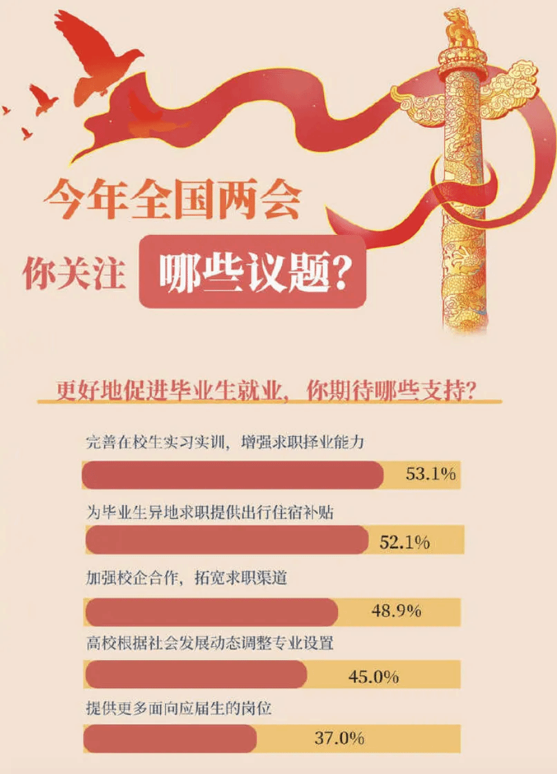 全国两会前夕,中青报社调中心进行的一项调查显示,就业、教育、医疗、住房等民生议题颇受关注。